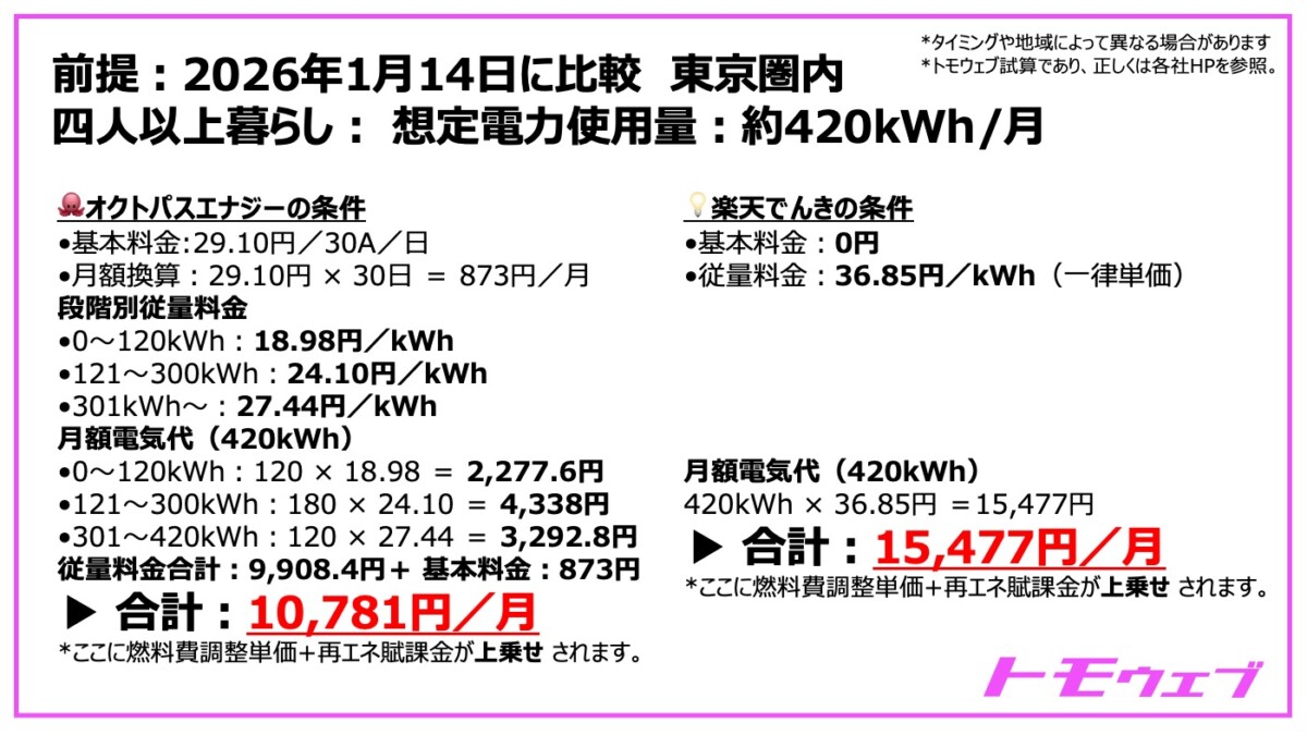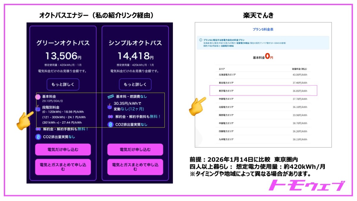 楽天でんきとオクトパスの料金構造を比較